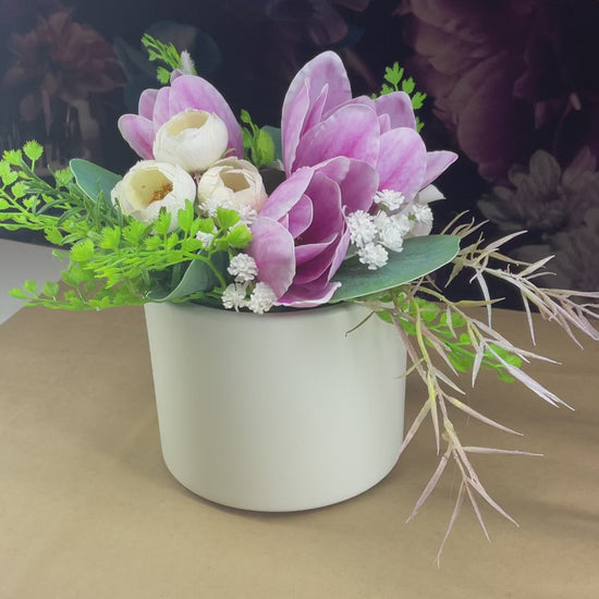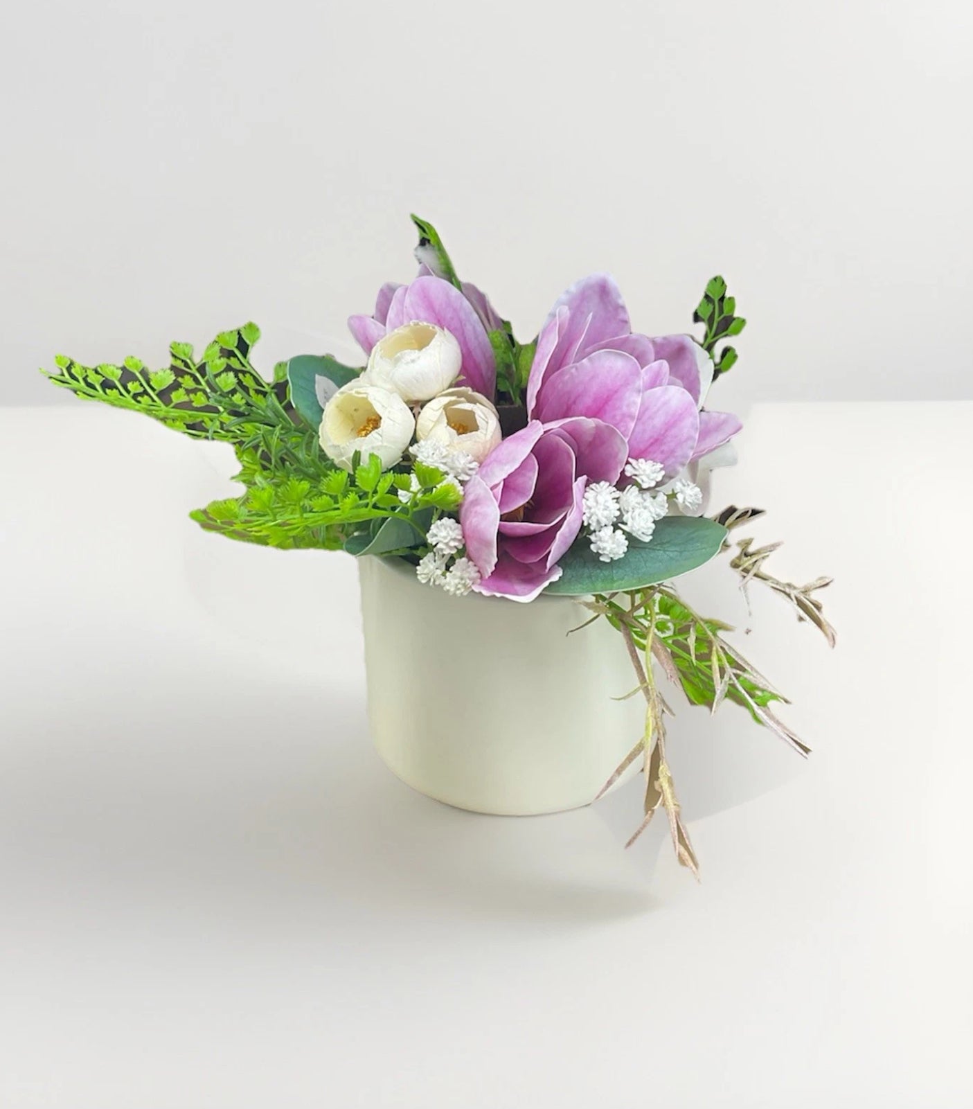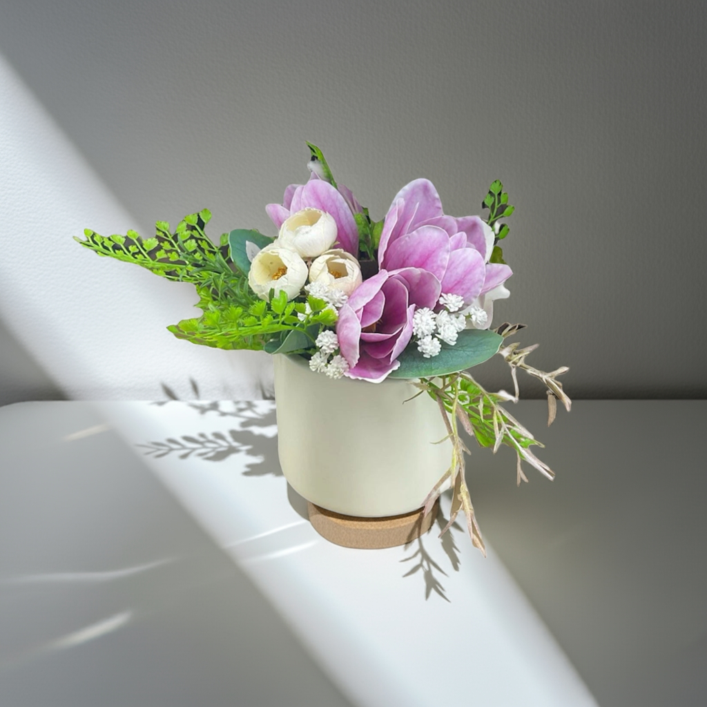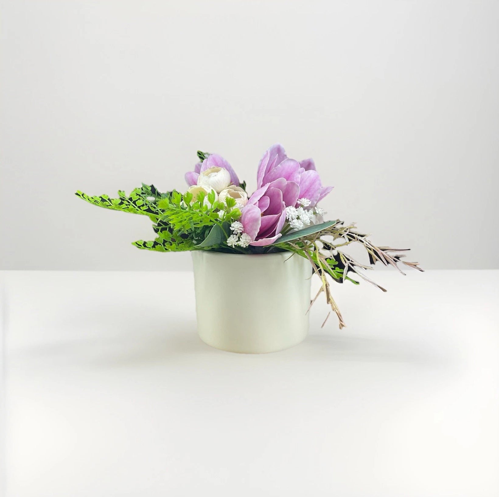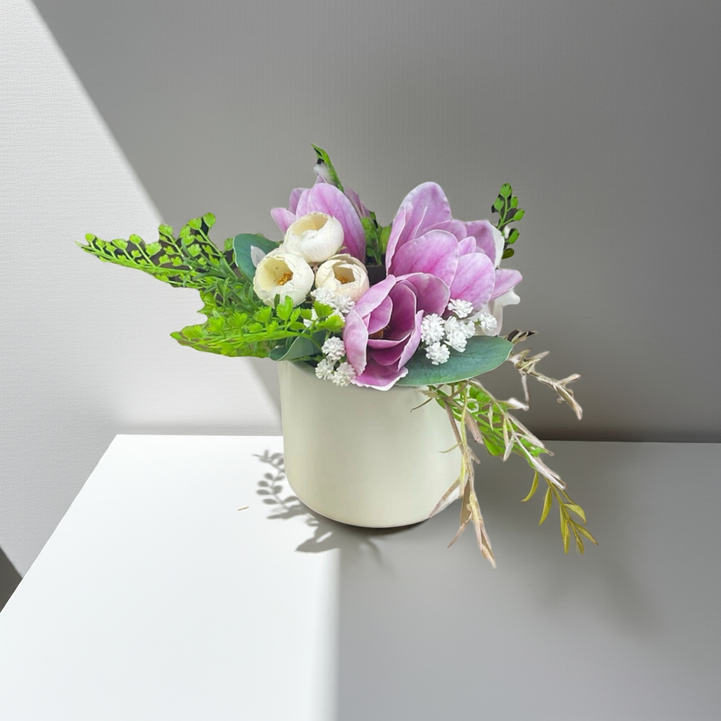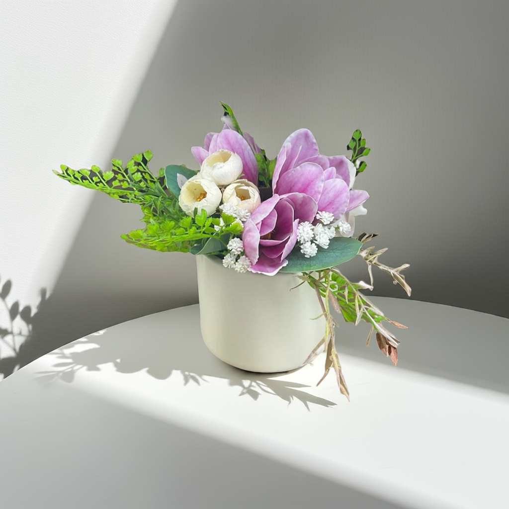 Ob als Tischdekoration oder als stilvolles Accessoire für Ihr Zuhause – dieser Blumenstrauß in der Vase ist ein elegantes und pflegeleichtes Highlight, das Naturverborgnisse in jedem Ambiente entführt.